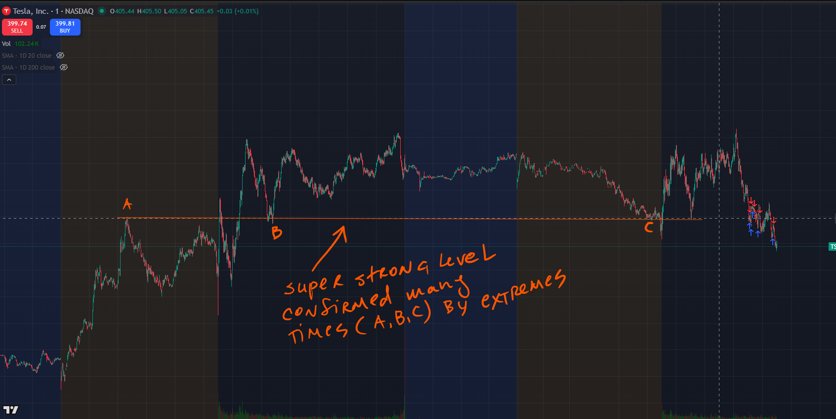 Here level is established in pre-session and confirmed right after opening. Then followed by a fights between sellers and buyers, buyers clearly win, and defend the level as its tested again.