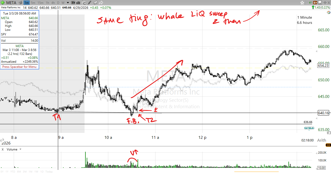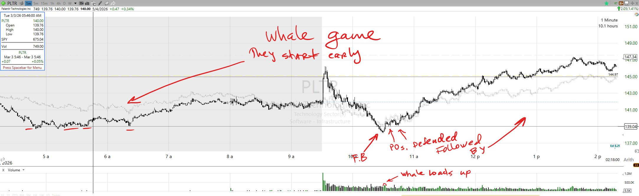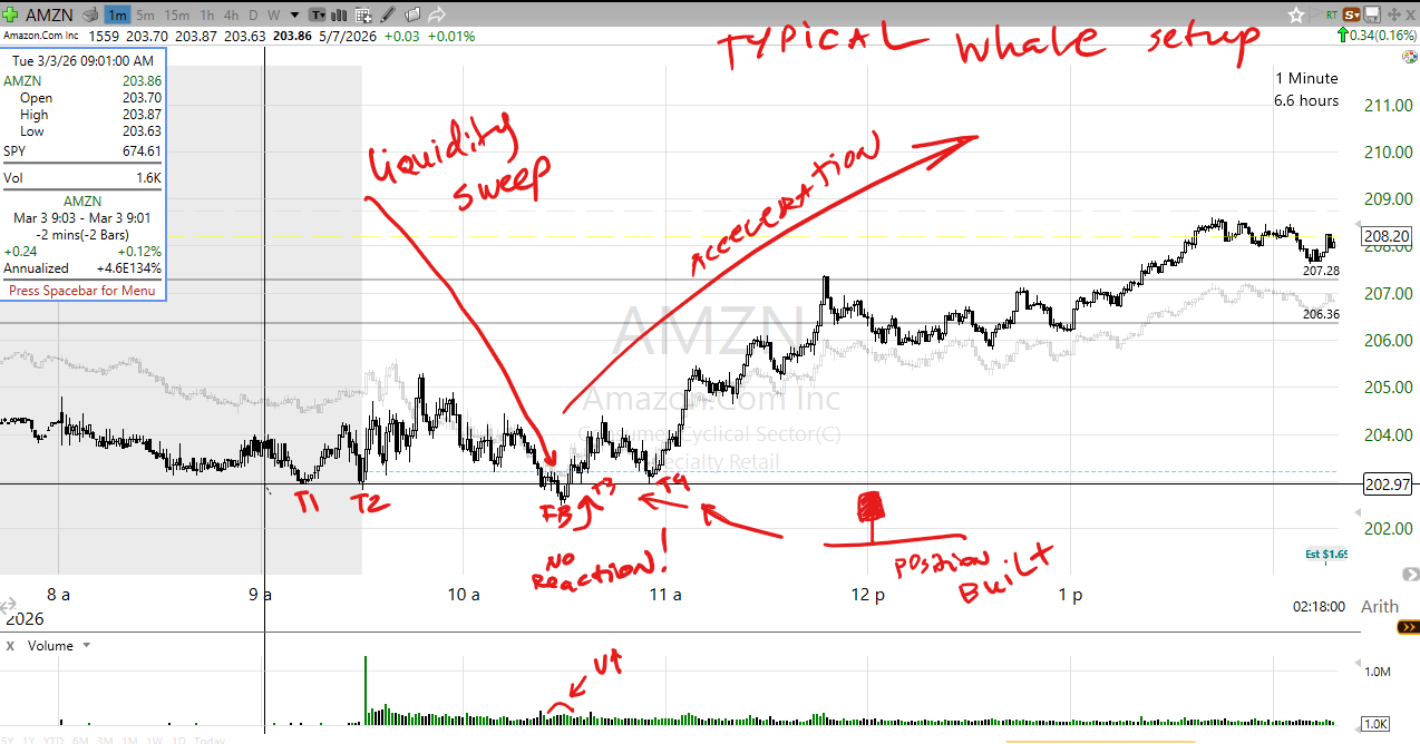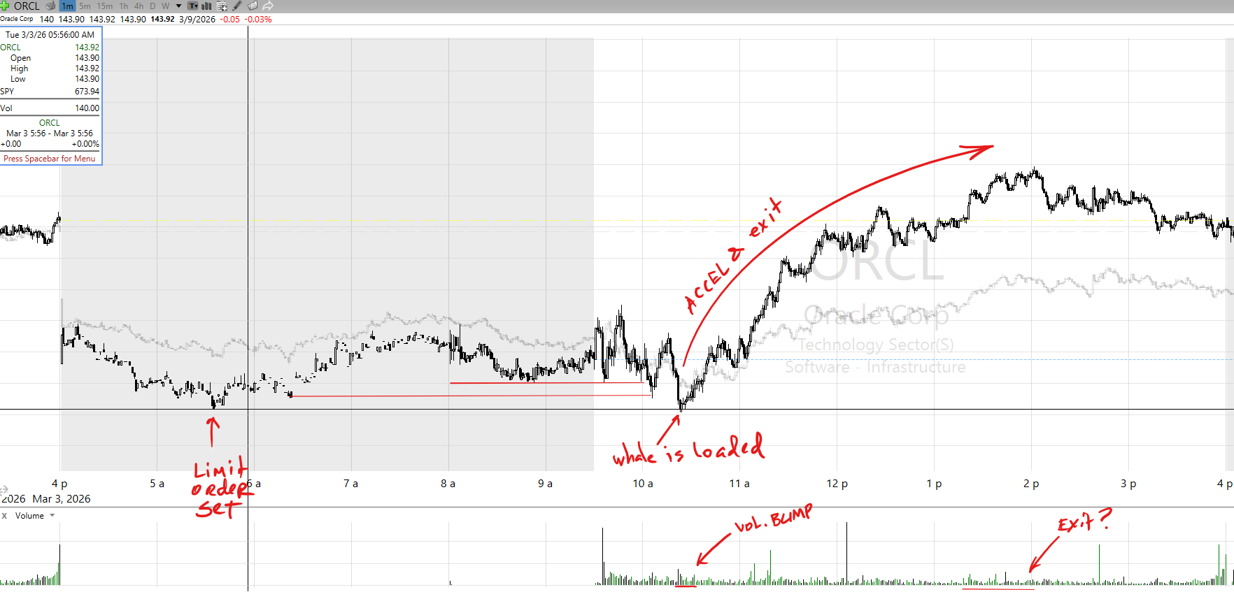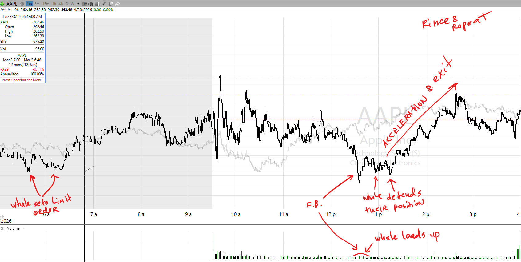 The whale builds their position somewhere before and during false breakout of the established pre-session low (low is there because thats where their limit order is). They are likely building their position in pre-session. Clearly this is only done on biggest of instruments.
